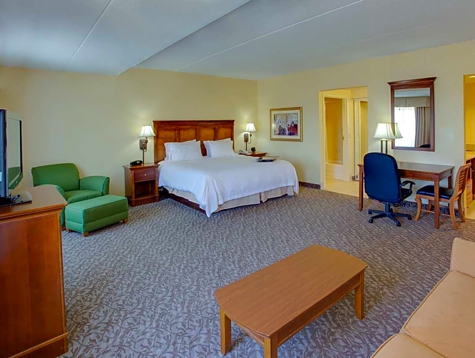 Sofa bed, free WiFi, 32-inch TV, refrigerator, microwave, coffeemaker, work desk, shower This spacious studio suite features our clean and fresh Hampton king bed®, a comfortable sofa bed, and a 32-inch LCD TV. Catch up on work at the large desk or surf the web with free WiFi access. Refresh in the bathroom which has a WaterPik showerhead and curved shower rod that allows more light and space in the shower. This room also has a refrigerator and microwave.