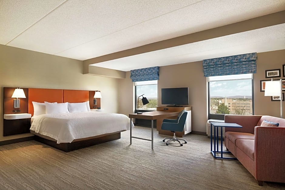 Sofa bed, free WiFi, 32-inch TV, refrigerator, microwave, coffeemaker, work desk, shower This spacious studio suite features our clean and fresh Hampton king bed®, a comfortable sofa bed, and a 32-inch LCD TV. Catch up on work at the large desk or surf the web with free WiFi access. Refresh in the bathroom which has a WaterPik showerhead and curved shower rod that allows more light and space in the shower. This room also has a refrigerator and microwave.